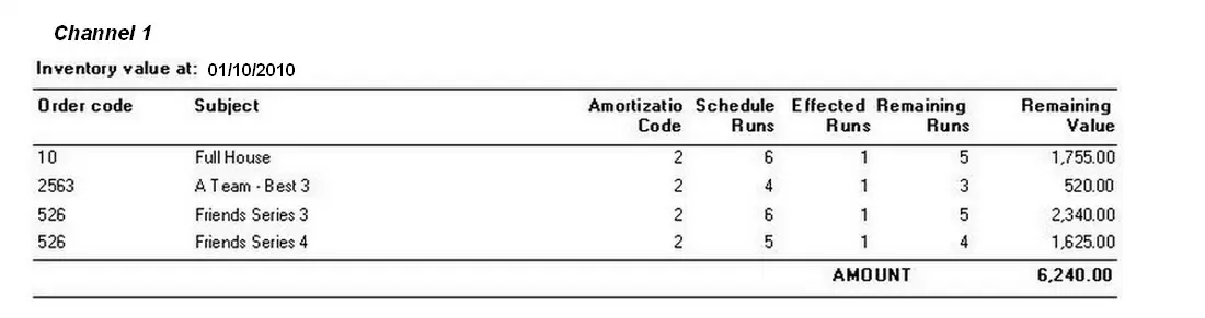 The Inventory Value report allows the generation of a document containing all the season statuses regarding their runs (scheduled, effected and remaining), their amortization codes and the remaining value of said runs still due to be broadcast.
