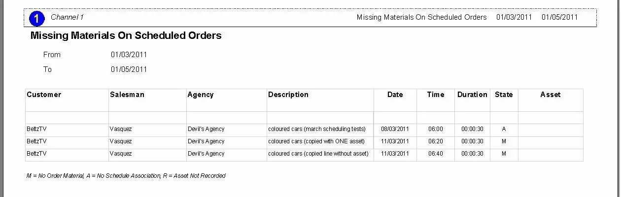 The Missing Materials on Scheduled Orders report permits the generation of a document containing a list of all those order lines scheduled to go on-air on a specific period which either have still not been associated with an asset, have still not been scheduled, or its associated asset has still not been recorded.