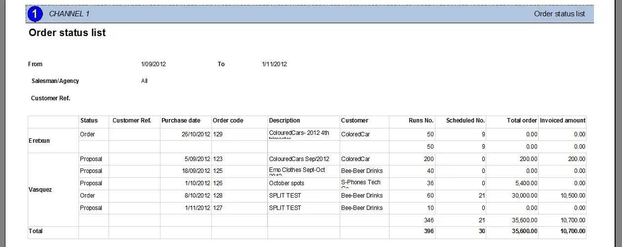 The Orders status list report allows the generalization of a document that highlights for a given period and account executive/agency all the managed orders or proposals, specifying for each one of them the number of expected and scheduled runs, as well as the total expected amount (entered during creation phase) and their total invoiced amount (computed from all scheduled performances); further organizing all data provided by grouping orders and proposals by account executive/agency.