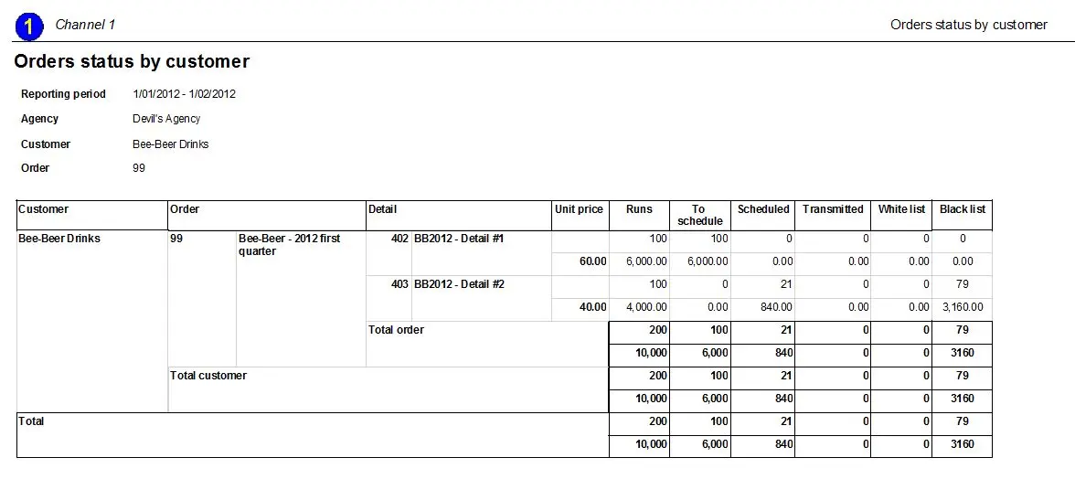 The Orders status by customer report allows the generation of a document containing all orders valid for a certain period, detailing for all their lines their scheduling status, total runs, remaining runs, scheduled runs, transmitted runs, and all scheduled runs present in white and black lists.