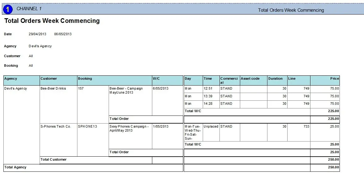The Total orders by week commencing report allows the generation of a document containing all commercial events scheduled for a specific customer on weeks commencing within a given period, detailing for each event its scheduled day, scheduled time, booking code, linked asset, scheduled duration, order line and price.