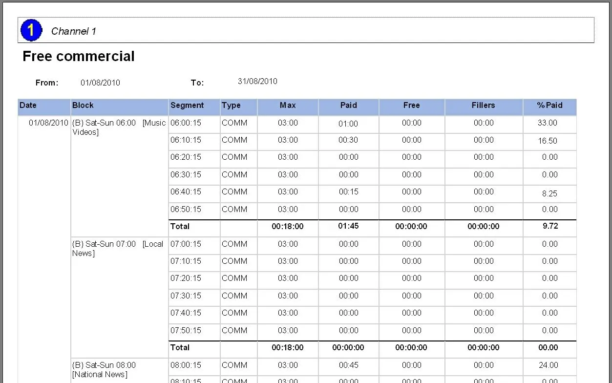 The free event report generates a document containing essential information on the space usage of a specific program type (e.g. spots) within a particular period's schedule structure (i.e. segments). The report detailed for all segments includes the following data: