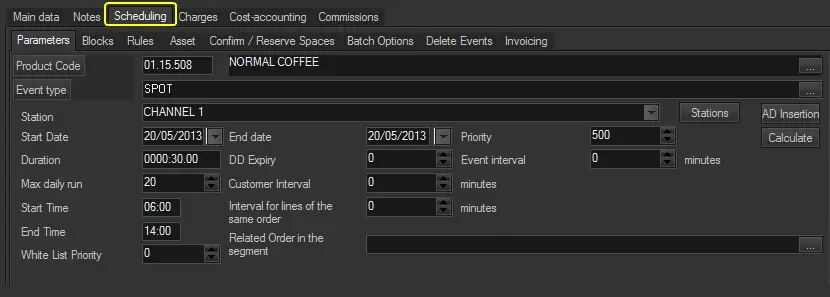 The scheduling of an order line (commercial event) begins with the insertion of all the technical data relevant to the commercial event; this data is inserted along the fields present in the Parameters tab as follows:
