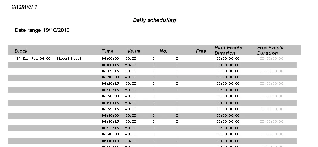 This report enables you to visualize and print the schedule of a particular day to include the following details: block name broken down into segments, segment start time, value of commercial events for the specific segment, number of commercial events, number of free events and duration of both commercial events and free events.