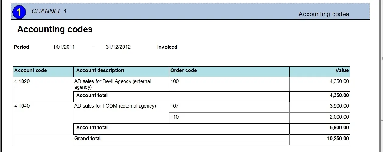 In this report, only the compensation accounts specifically set for order lines, customer/agency and events default accounts won't be considered. Refer to the available invoice modes chapter for more details on compensation accounts.