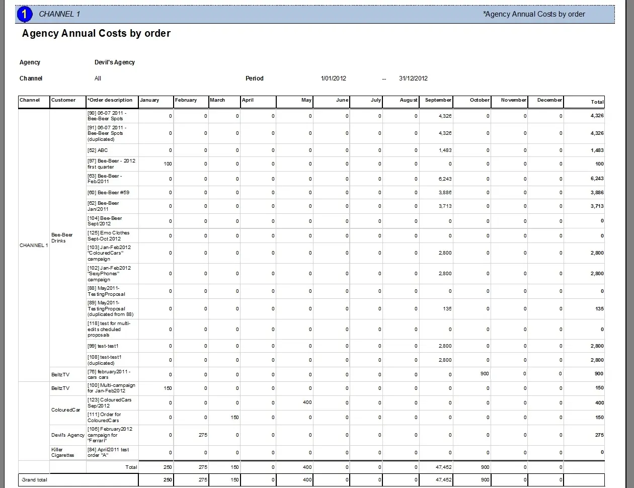 Unlike the "Agency Annual Costs by scheduled" report, the current report calculates the costs based on the order items (spots) expected to be broadcast according to the order information.