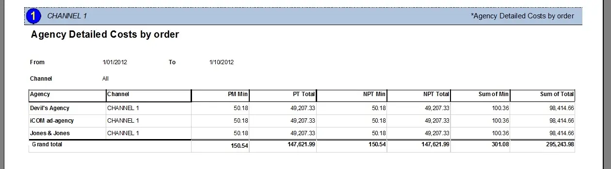 The Agency Detailed Costs by Order report allows the generation of a document containing all the costs (commissions) derived from the transmission of commercial orders; grouping said charges by agencies and classifying them by prime time and non-prime time slots.