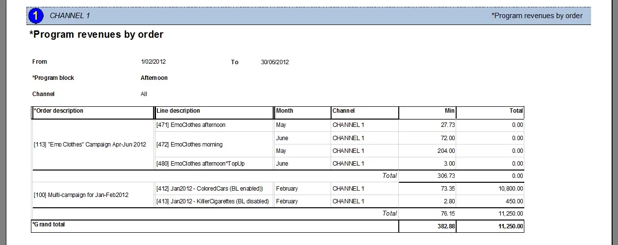 The Program Revenues by Order report allows the generation of a document containing the monthly revenues earned from orders scheduled on specific program blocks, narrowing the information to a particular network station and scheduling period. Displayed data include: