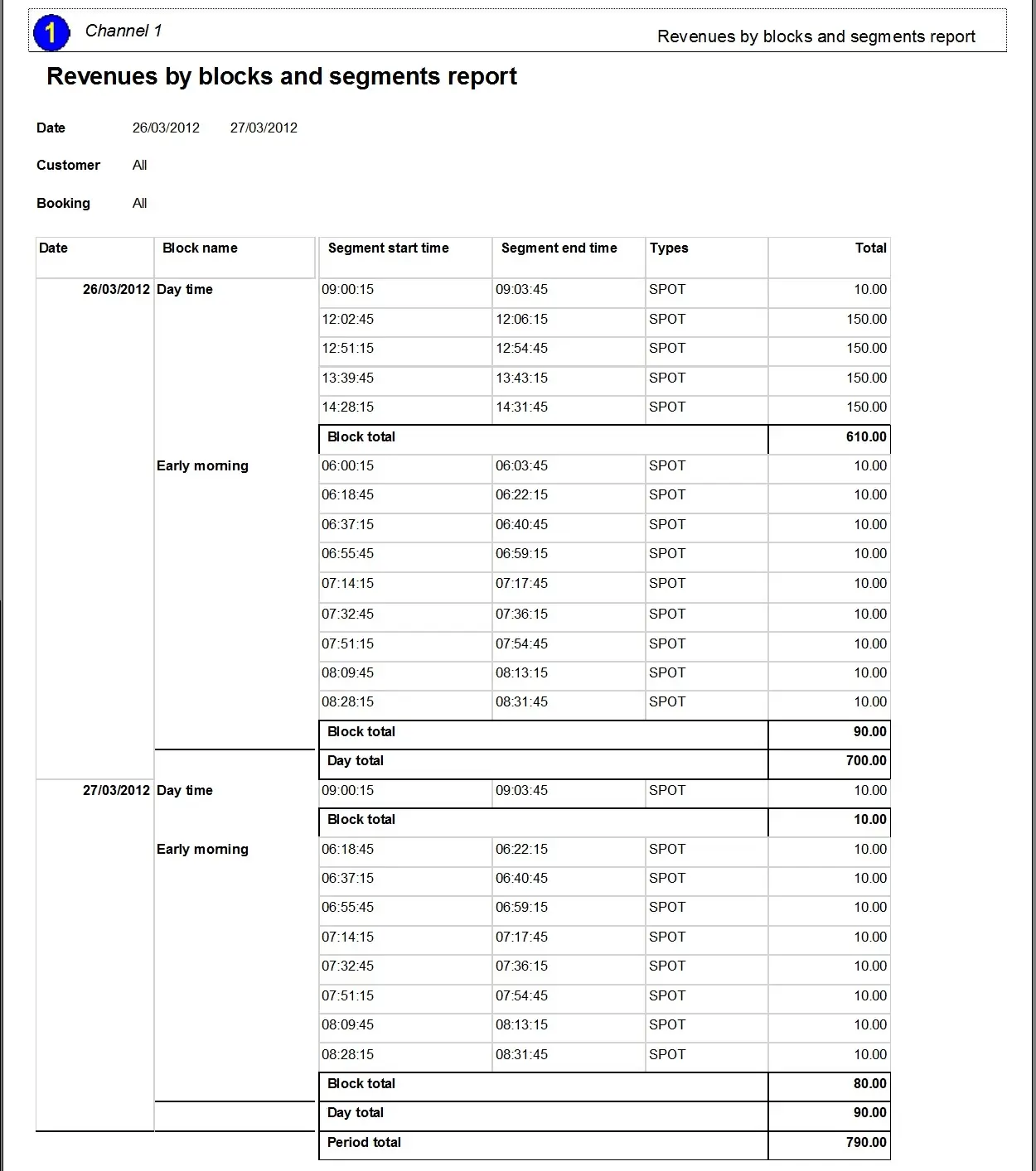 The Revenues by Blocks and Segments report allows the generation of a document containing all the revenues derived from the blocks and segments present within the scheduling structure of a certain period, thus permitting quickly consult the incomes of customers and orders according to the air space on which they advertise.
