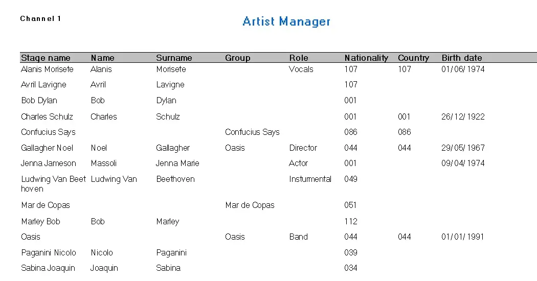 The report may be based on a Stage name, Name, Surname or Group; it can be found on any of the previously mentioned 'headings' and, more specifically, whether they start with a specific letter, those that contain a specific word and finally, a selection of artists between x and y. For example, generating a report of all the Artists held in the database whose name starts with 'ST' produced the following result:
