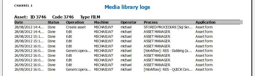 The Media Library Logs report allows for generating a document containing all the operations performed for a specific asset (e.g. creation, edit, copy, upload, etc.), describing the name, workstation, operator and exact process for each operation.