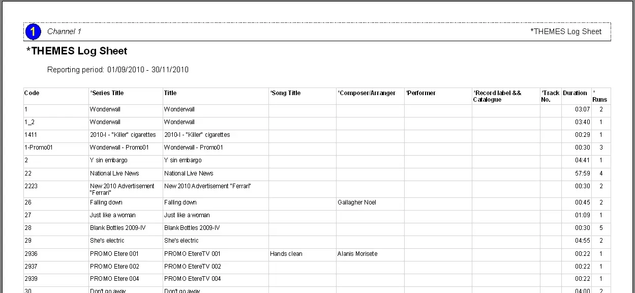 The 'Themes Log Sheet' report permits stations to generate a report containing all the events programmed on the on-air schedules of a specific date range.