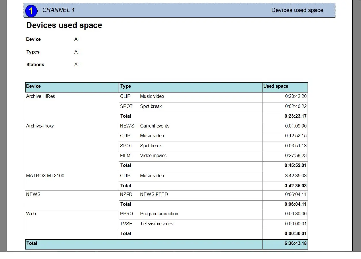 Notice that this report is based on the information also displayed in the Etere configuration module, under the Settings | Devices | Cloud-devices section, where all station's meta devices are displayed, including their used space, being possible to set for every one of them the maximum usable space for both the station's assets and shared ones.