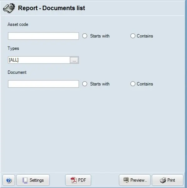 Document: The report should include the documents linked to the assets. Documents listed in the report consist of virtual documents and the name of the attached documents and virtual documents. Select option “*Start with” or “Contains” to narrow the search by filtering documents starting with / containing certain characters in the document name.