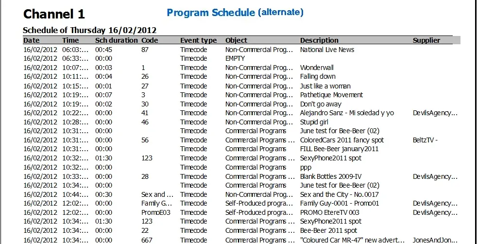 As its name suggests, the Program Schedule (alternate) report is an alternate version of the Program Schedule report containing the same playlist but featuring different properties (columns) for each event scheduled on it. the program schedule (alternate) allows one to view the playlist differently without redesigning the program schedule report.