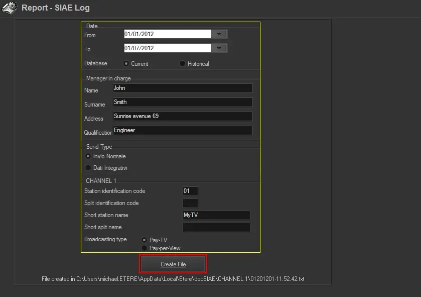 To generate the file containing the SIAE Log, just press the [Create file] button; the file will be created in the Etere Data Folder with the following name format: