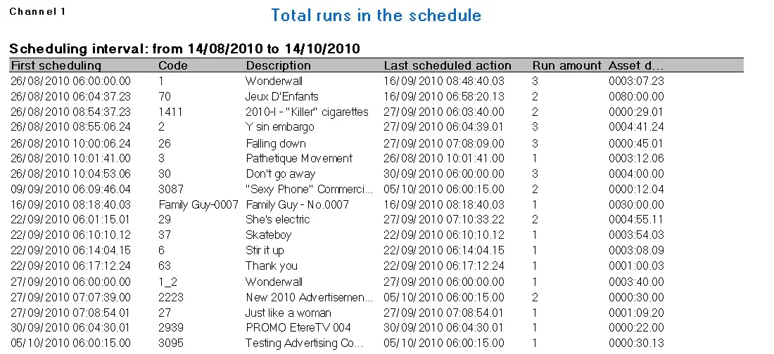 This report shows all the assets scheduled within a defined time range, including the total number of times that they have been scheduled. Besides scheduled events, any “Live” event planned within the specific period is also captured in the report.
