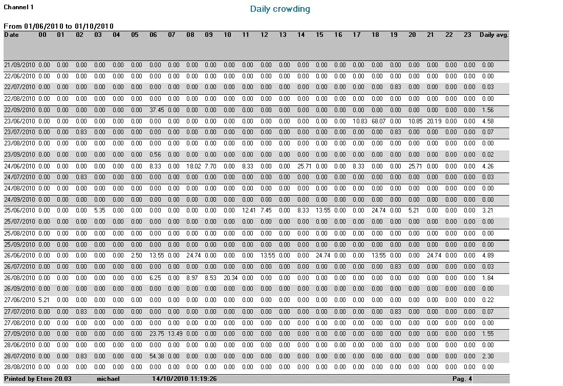This report allows printing a report or generating a CSV/XML file containing all the crowding information related to a specific time interval. Crowding is provided as a percentage information for each hour and the daily average.