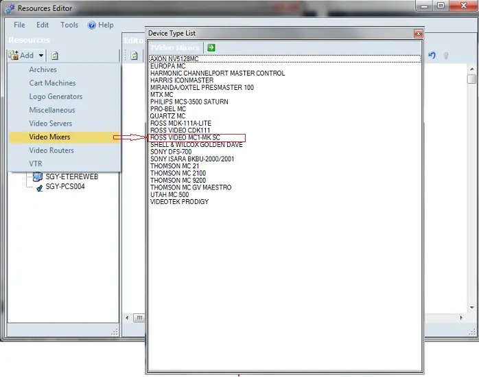 The Master Control Ross MC1 must be added from Etere Configuration > Resource Editor.