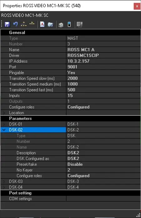 Driver: Enter driver ROSSMC1SCIP or ROSSMC1SC. Both are based on the Presmaster protocol. The first driver is via TCP/IP; the second is for serial RS-422 remote access.