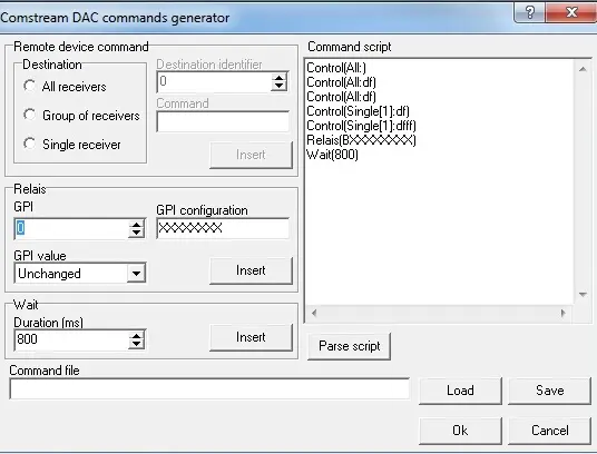 •Remote device command: Indicate if the command will be executed on all receivers, a group of receivers or a single receiver. Indicate also the destination ID as well as the command to be executed. Press the [Insert] button to add this parameter to the command script.