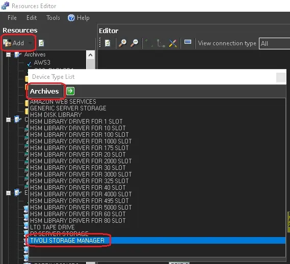 •Choose TIVOLI STORAGE MANAGER from the Device Type List> Archives form