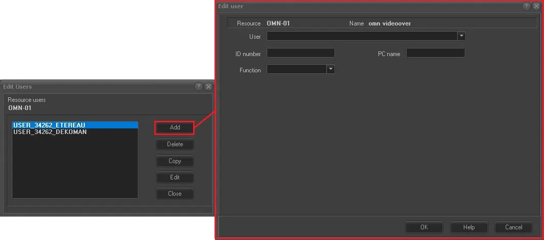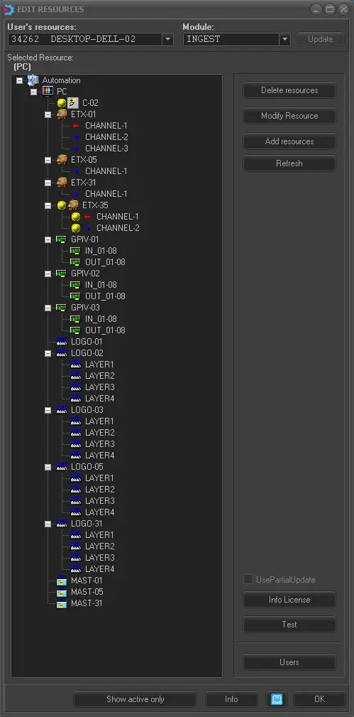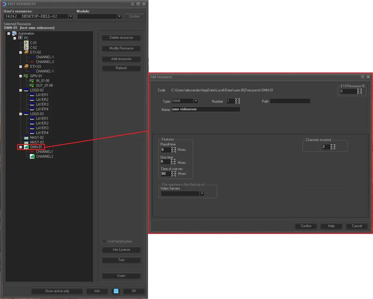 User's Resources and Module - Select the Etere PC and Etere module (e.g. Ingest, Automation, Scheduling, etc.) for which resources will be managed; this is for highlighting all those devices present in the resource tree which are currently enabled.