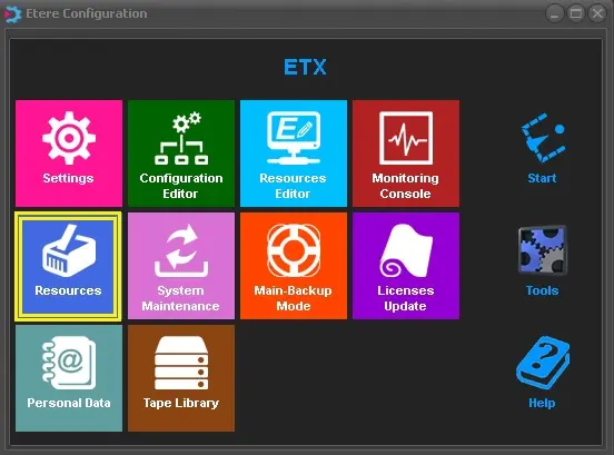Legacy resources (i.e., devices that Etere manages using a legacy configuration method) are configured in the Resources module. The Resources module is available from the Etere Configuration main menu: