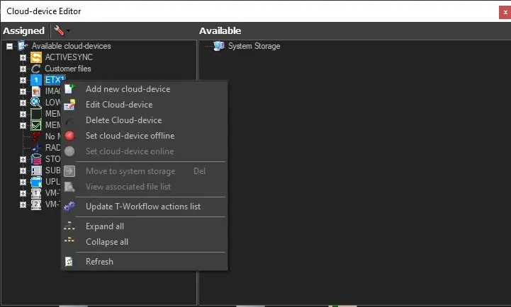Set cloud device offline - Set the selected meta device as offline and set all its volumes and metafiles stored as "unavailable" (e.g. unable to be used).