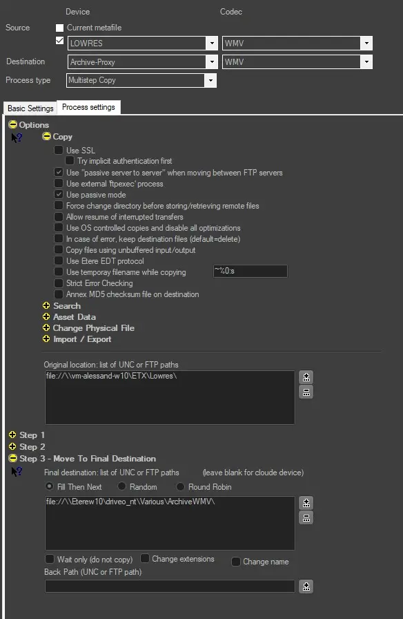 • Process settings - Original location: by clicking on the '+' button of the Options node, you can force the path from which video files would be copied. Otherwise, the first path in the source meta device will be used.