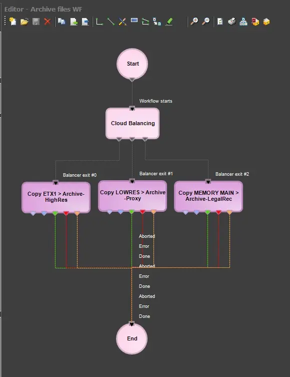 Follow the procedure below to create a simple T-workflow that copies the files from a specific meta device (e.g., 'Lowres') to another one (e.g., 'ArchiveProxy'):