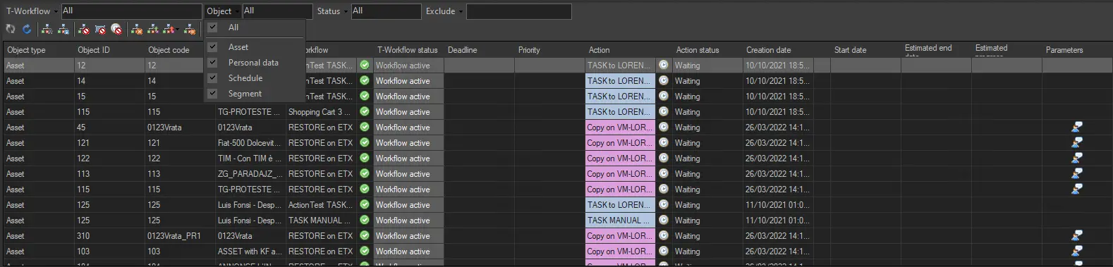 For each T-workflow action displayed here, it will be detailed its "Object type", "Object ID", "Object code", "Object description", "T-workflow", "Workflow status", "Deadline", "Priority", "Action", "Action status", "Creation date", "Start date", "Estimated end date", "Estimated progress" and "Parameters".