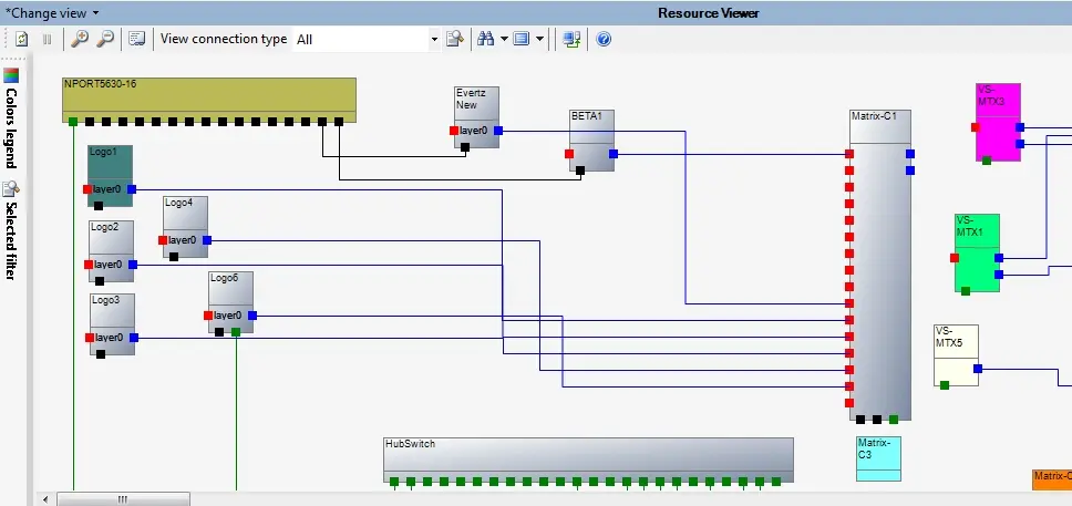 The "Resource Viewer" module allows one to view (not edit) all the resources in the system and real-time information on the connection status and SNMP messages of these resources. The "Resource Editor" is a static view of all devices installed in the system, and it is updated as different resources are used and connections activated: