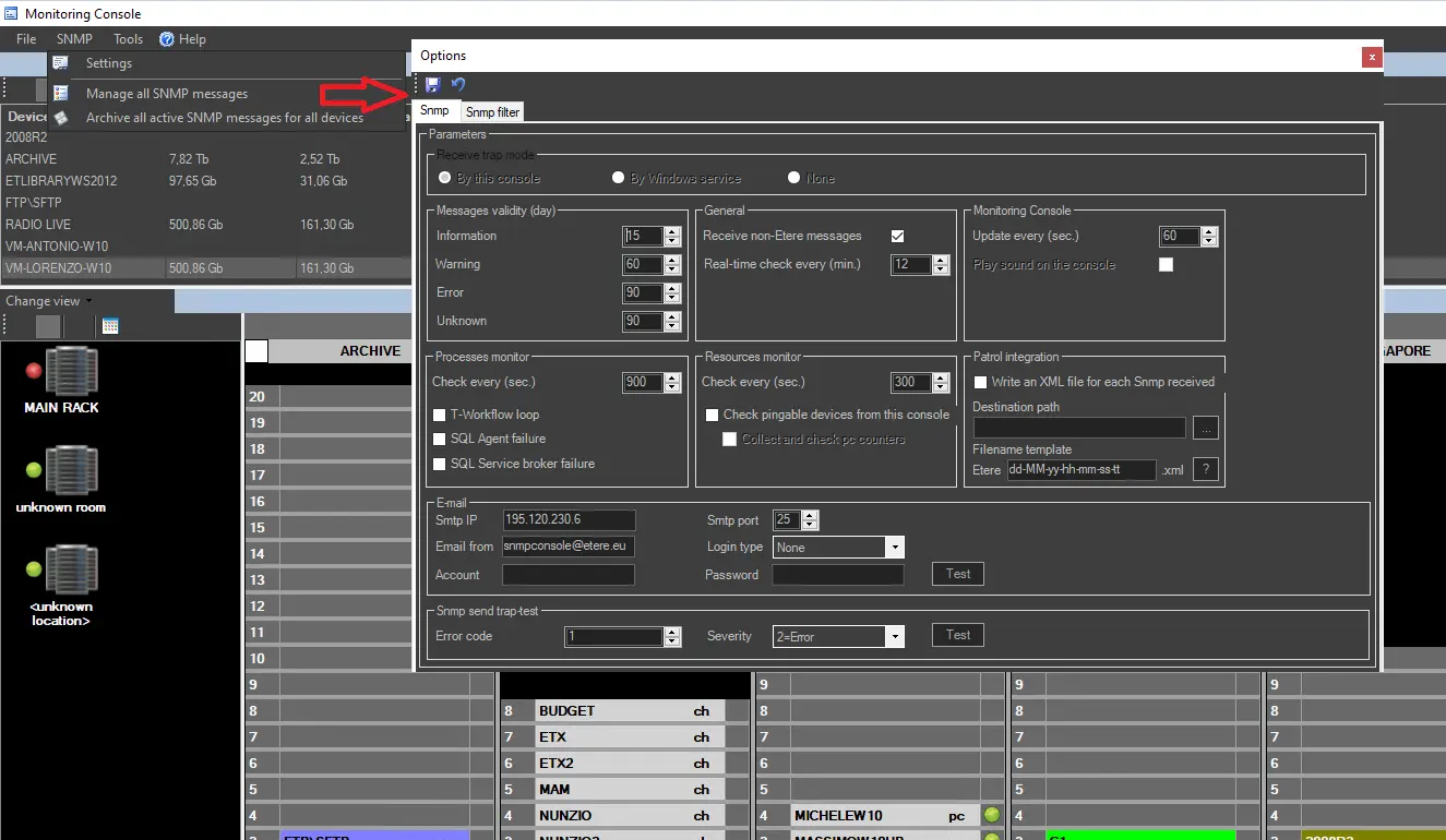 The main options of the Monitoring Console can be accessed through the Etere Configuration > Monitoring Console > SNMP menu; there, it will be possible to specify the following parameters: