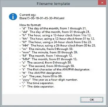 • Filename template: The XML file would be created with prefixes “Etere” and “dd-MM-yy-hh-mm-ss-tt” to indicate the date and time of the file creation. The template can be customised.
