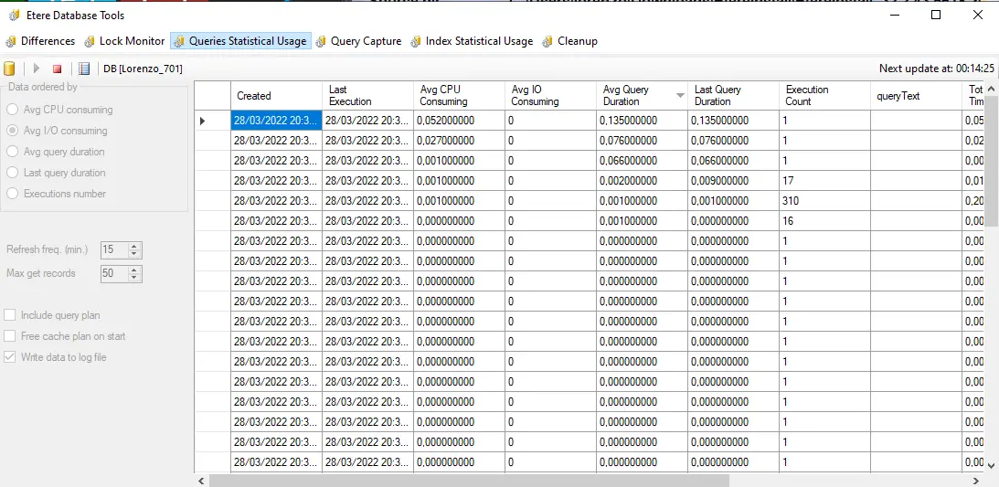 The "Queries Statistical Usage" tab provides an interface to retrieve from the SQL Server some key statistics regarding the performance of executed queries, thus allowing to individuate potentially slow/expensive queries (i.e. which execution is taking too much time, memory or CPU usage).