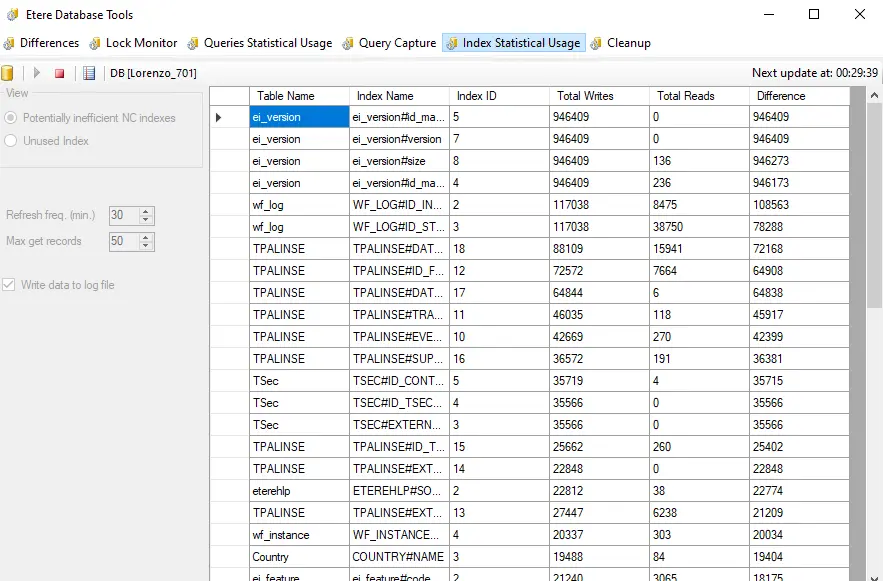 The "Index Statistical Usage" tab provides an interface to retrieve from the SQL Server some key statistics regarding the usage and performance of indexes, thus allowing the individuate of potentially unused indexes (i.e. written most of the time but rarely read).