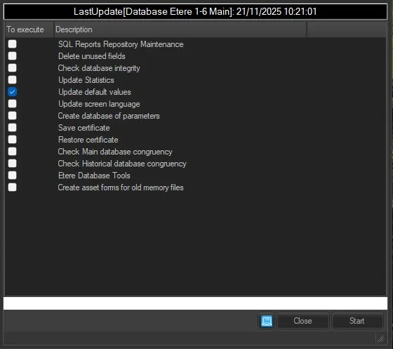 The operation Update default values was integrated with "Check main database structure", but since the new system maintenance doesn't execute this step, in the last 35.2 versions it has been separated and placed as a different system maintenance operation, allowing to launch it anyway from Etere Configuration when necessary.