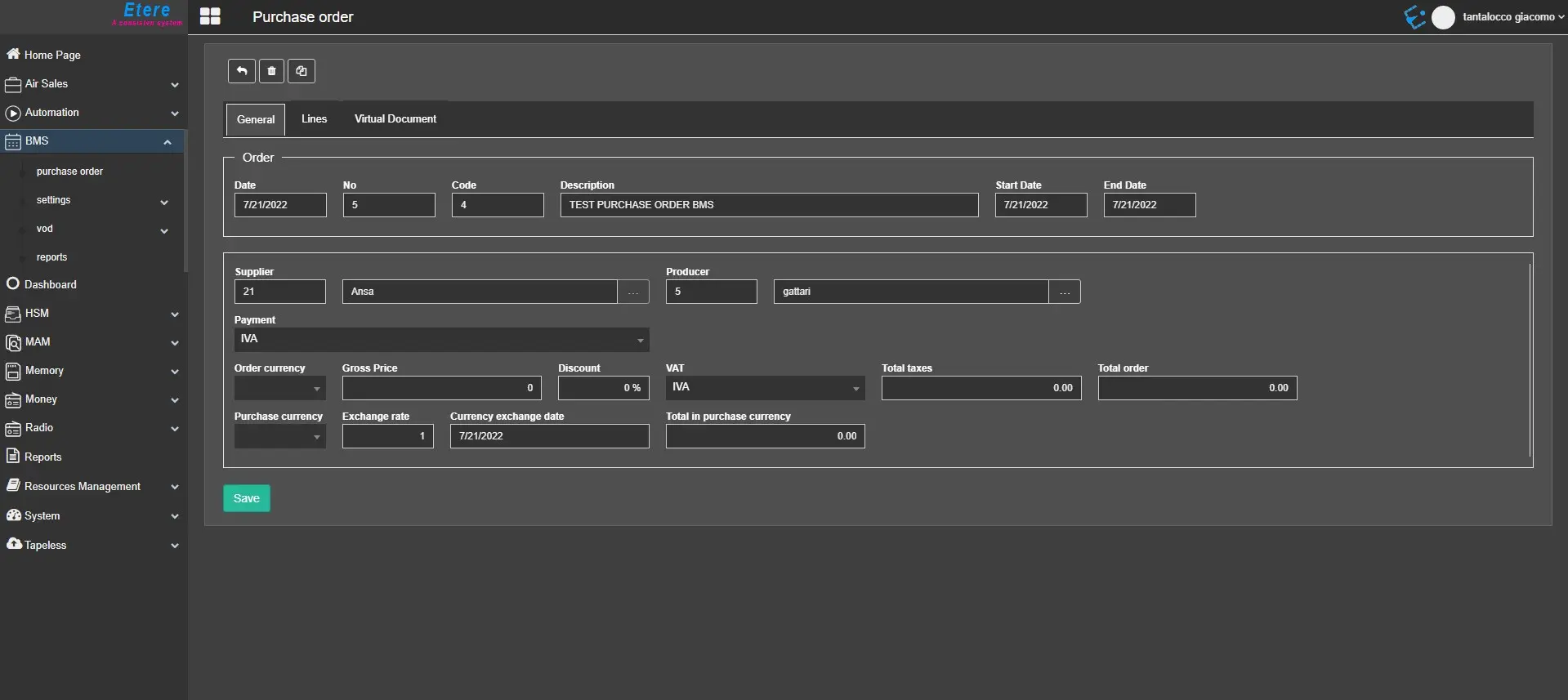 VAT: VAT code (Value Added Tax) in percentage needs to be assigned to the purchase order. VAT codes are pre-configured in Etere Configuration > Settings > Invoicing data > Codes GST.