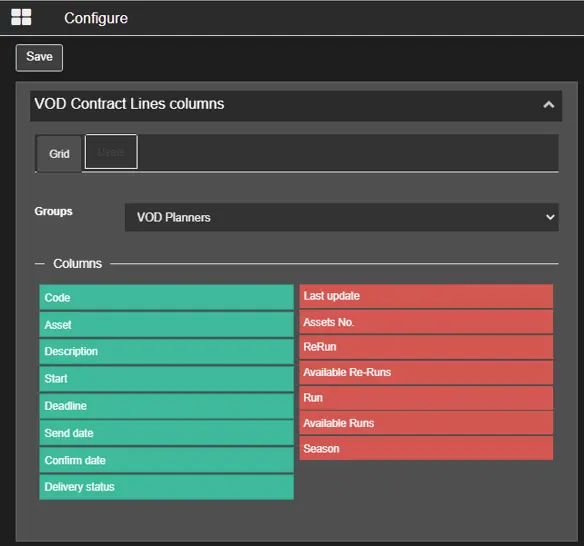 Grid: In this tab, select an Etere user group in charge of the VOD contracts, e.g. Administrator, Everyone, VOD Planners or any user group defined in Etere. Once the user group is selected, the columns available for the selected user group will be displayed. The columns on the left, in green, are the ones enabled and displayed, while the columns on the right, in red, are not visible in the lines tab of the contracts. In this tab it's also possible to change the position of the enabled columns, arranging them in the list with a drag & drop. The enabled columns and their position will be then reflected in the form that opens when clicking on Column settings button, in the Lines tab of the contracts.