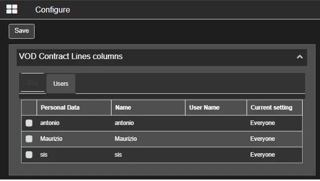 Users: The User tab lists the users inlcuded in the above-selected group, allowing to save the columns setting for specific users only.
