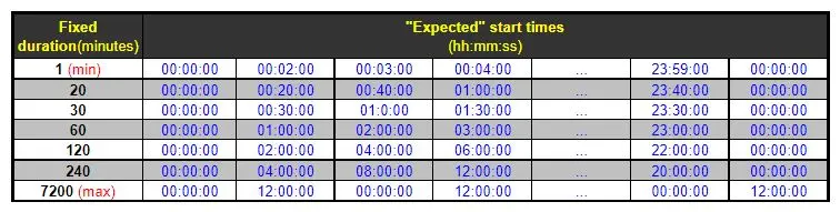 In case a recording (e.g. 60 minutes duration) starts at a time (e.g. at 13:42:00) different from the "expected start time" (see table above), said recording will be performed only until the next "expected start time" (e.g. 14:00:00), thus allowing following recordings to start at standard times (e.g. 14:00:00, 15:00:00, 16:00:00 and so on).