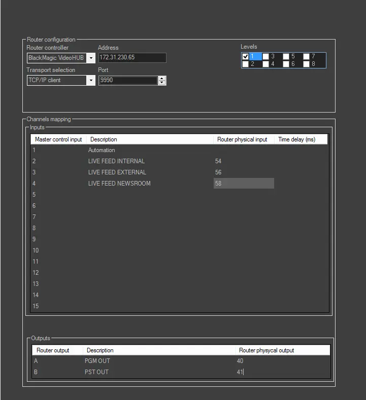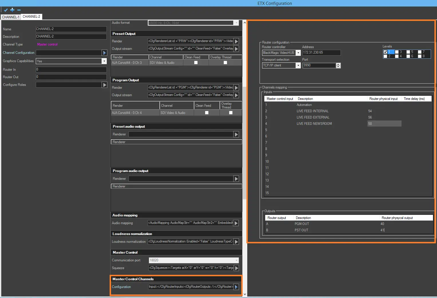 After the router has been selected, the next step is the channel mapping. Configure the channels of the router that must be used as inputs (Live input A and Live input B) and outputs (Preset and Program output).