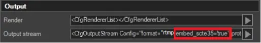 In the example below, custom string <embed_scte35='true'> has been inserted into output stream, to manage the SCTE-35 cue tone in RTMP streaming.