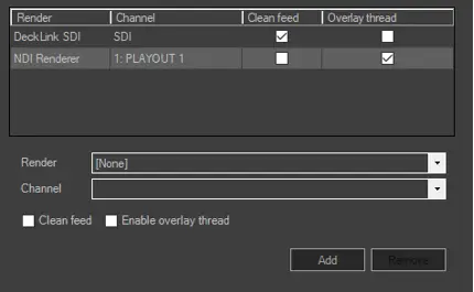 Channel: Specify a channel of the preset and program output. Once selected the output render and channel, you can select the “Clean feed” (render without any CG) or "Overlay thread" (CG loaded in a separate thread) options during the output streaming.
