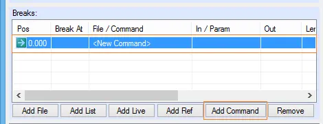 By pressing the Add Command Button on the Breaks Section, it is possible to add any command as a break.