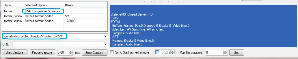You might set the URL address and click the <Start Capture> button to trigger the DVB streaming.