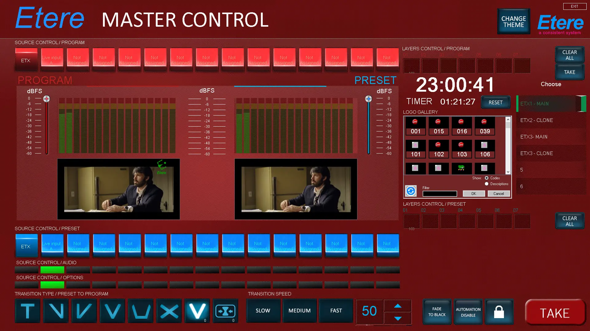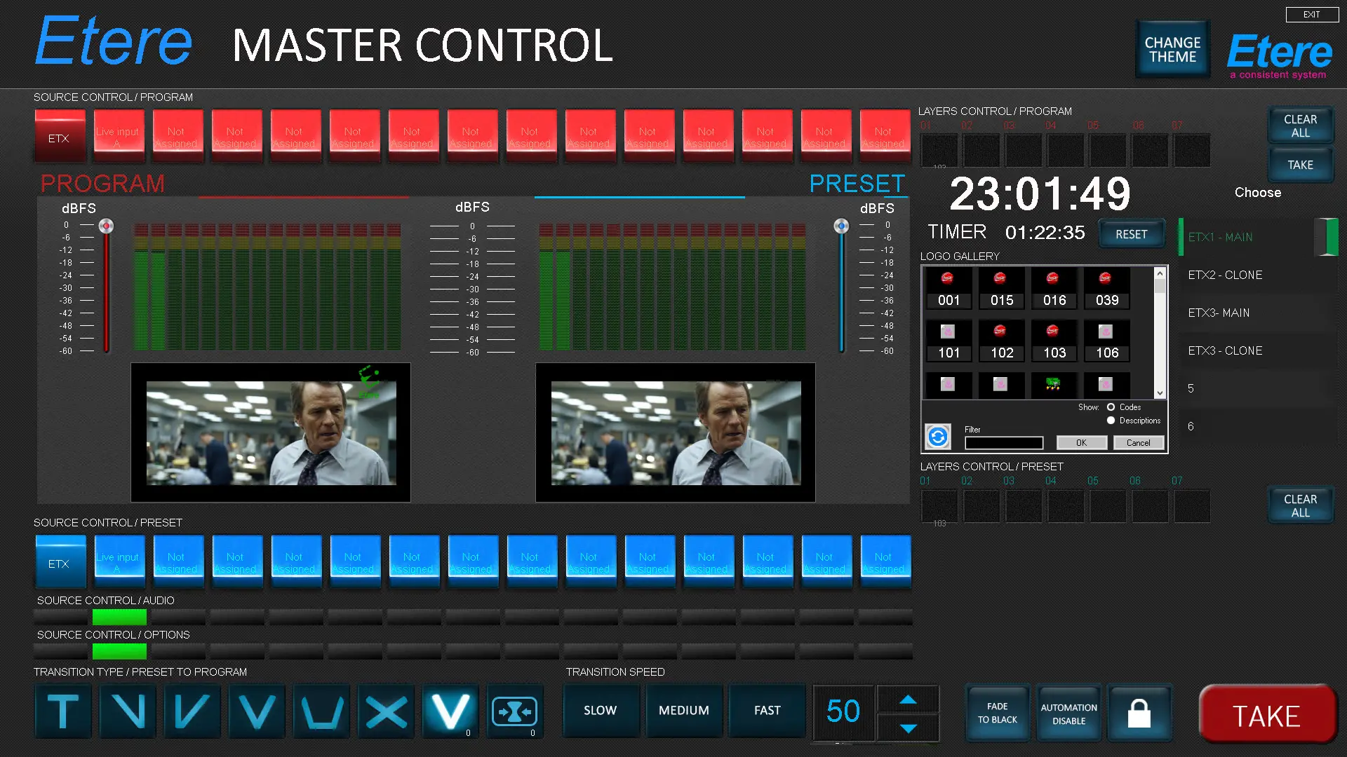 The Change Theme button at the top right corner of the Etere Master Control Panel allows you to change the background colour of the desktop displays.