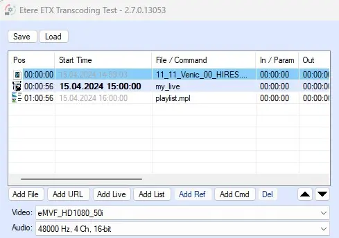 Above the playlist table, the button Save allows to export a playlist in .mpl or .xml format, while the Load button allows to import a previously saved playlist.
