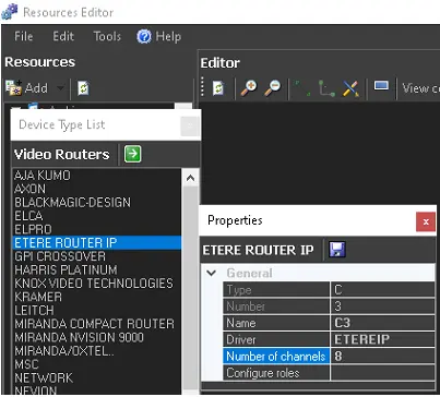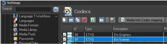 In Etere Configuration > Settings> Devices Settings > Codecs, a default codec “ETXG” and "ETXS" with property ETX Graphics and ETX Scene must be defined in "Codecs" settings respectively, in order to save the graphics assets and scene projects. You can add more types for scenes and graphics to the list.